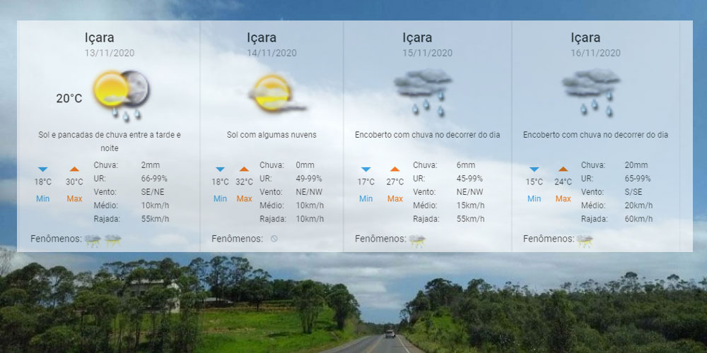 Do Planalto ao Litoral, pancadas isoladas de chuva com trovoadas e temporais isolados ainda podem ocorrer na tarde e início da noite desta sexta-feira, dia 13. No sábado o tempo melhora, mas no domingo as condições de chuva retornam. Para Içara, o Centro de Informações de Recursos Ambientais e de Hidrometeorologia de Santa Catarina aponta de 15°C a 32°C no período.