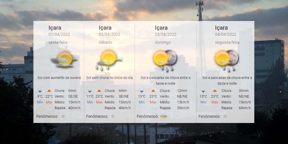 O fim de semana será de temperaturas amenas para agradar, ainda que no outono, quem curte o inverno. O Centro de Informações de Recursos Ambientais e de Hidrometeorologia de Santa Catarina aponta mínimas de 9°C a 15°C e máximas de 22°C a 23°C para Içara nos próximos dias. O que aumenta é somente as condições de chuva a partir já deste sábado, mas com maior probabilidade entre a tarde e noite de domingo e segunda-feira. Confira abaixo a previsão completa.