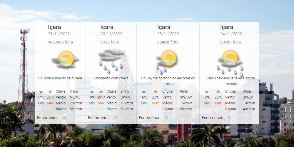 O calor permanece nesta segunda-feira, dia 21, e deve chegar ao ápice da semana com 32°C. Já na terça-feira, é a nebulosidade que mais aumenta junto com a perspectiva de chuva distribuída também pelos próximos dias. Para Içara, o Centro de Informações de Recursos Ambientais e de Hidrometeorologia de Santa Catarina aponta mínimas de 14°C a 19°C, máximas de 22°C a 32°C e até 9mm. Confira a previsão completa.