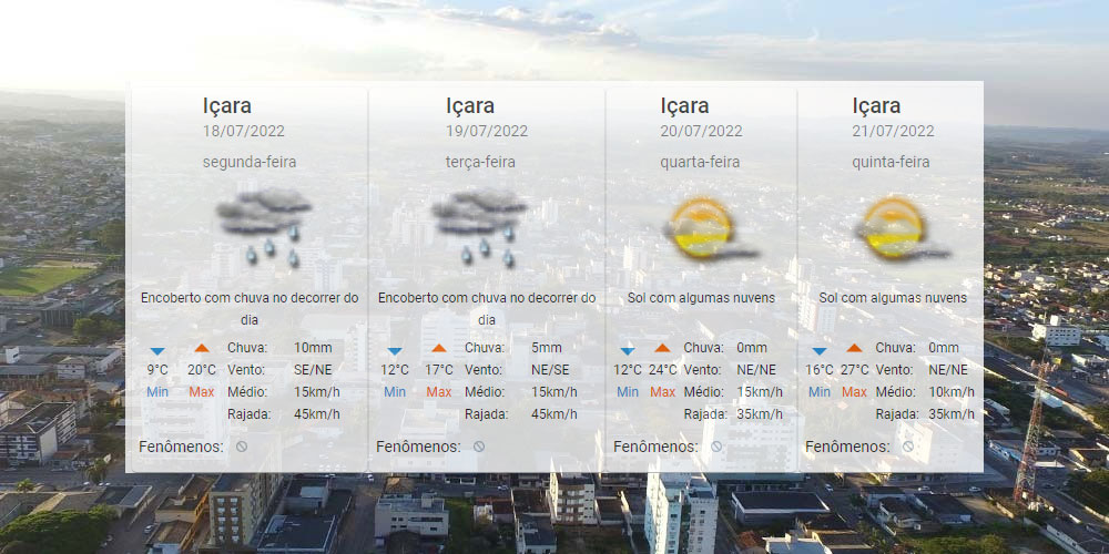 O céu encoberto com chuva ao longo do dia ainda segue até terça-feira, dia 19. Para o restante da semana, as nuvens também estarão presentes, mas de forma menos intensa. A tendência será então de elevação da temperatura. Para Içara, o Centro de Informações de Recursos Ambientais e de Hidrometeorologia de Santa Catarina indica de 9°C a 27°C no período. Confira a previsão completa: