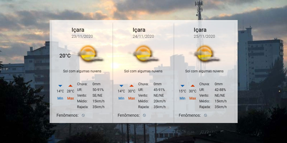 Os próximos dias serão de sol e elevação na temperatura. Para Içara, o Centro de Informações de Recursos Ambientais e de Hidrometeorologia de Santa Catarina aponta mínimas de 14°C a 15°C e máximas de 28°C a 30°C. Confira a abaixo a previsão completa para o estado.