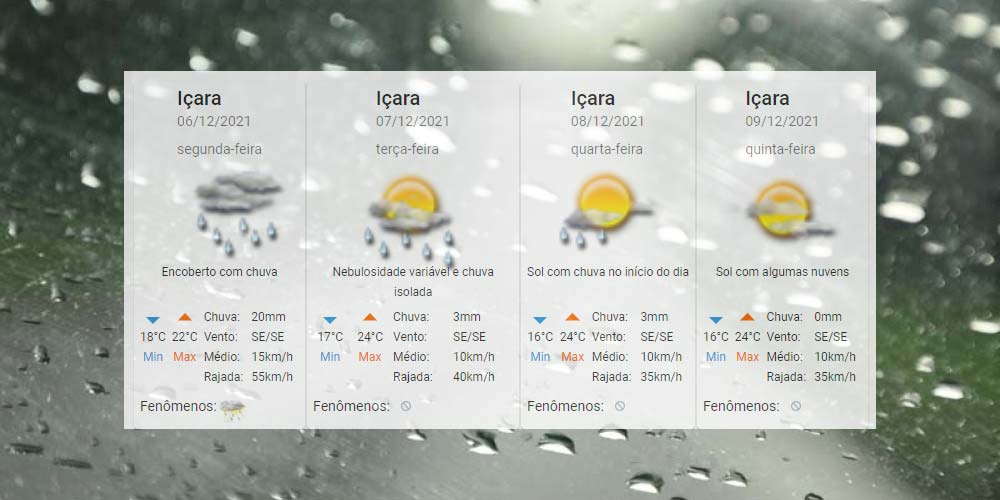 A condição para temporais localizados com pancadas de chuva, raios, rajadas de vento acima de 60km/h e granizo está presente principalmente do Meio-Oeste ao Litoral de Santa Catarina. A atenção recomendada pela Defesa Civil se justifica pela chuva de forte intensidade em curto intervalo de tempo (30mm/h). Quanto a temperatura, o Centro de Informações de Recursos Ambientais e de Hidrometeorologia de Santa Catarina indica de 16°C a 24°C ao longo dessa semana.