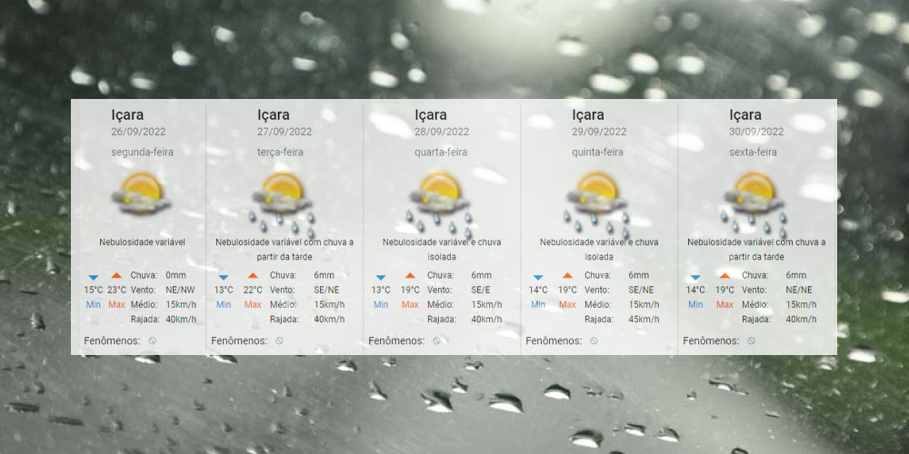 As temperaturas permanecem amenas nesta semana junto com a nebulosidade variável e possibilidade de chuvas isoladas. Para Içara, Centro de Informações de Recursos Ambientais e de Hidrometeorologia de Santa Catarina aponta até 6mm de precipitação por dia e de 13°C a 23°C no período.