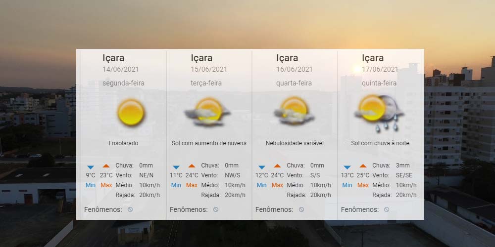 Segunda-feira será ensolarada em Içara. Mas até quinta-feira ainda deve surgir momentos de nebulosidade, inclusive, com possibilidade de chuva fraca. Para Içara, o Centro de Informações de Recursos Ambientais e de Hidrometeorologia de Santa Catarina aponta também de 9°C a 25°C nos próximos dias. Confira a previsão completa:
