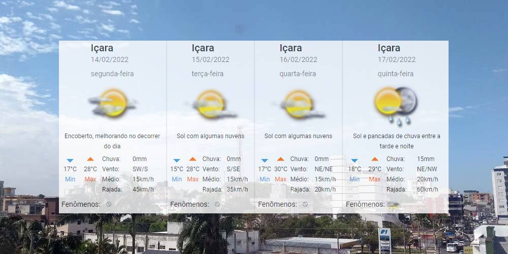 Os próximos dias serão de poucas nuvens, de muito sol e com a temperatura em elevação no Litoral Sul. Para Içara, o Centro de Informações de Recursos Ambientais e de Hidrometeorologia de Santa Catarina aponta de 17°C a 30°C até quinta-feira. Confira a previsão completa.