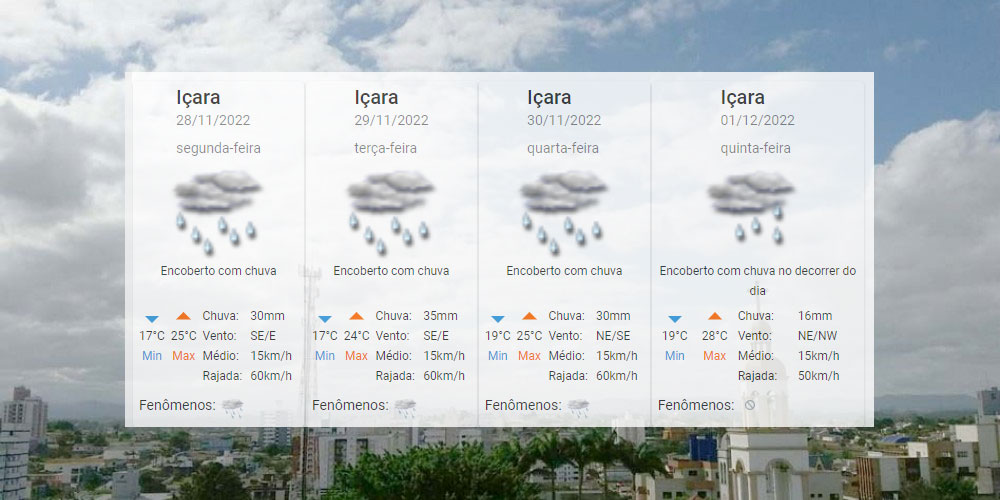 O céu encoberto vai se estender ao longo da semana. E essa nebulosidade chega junto com até 35mm de chuva por dia. Para Içara, o Centro de Informações de Recursos Ambientais e de Hidrometeorologia de Santa Catarina indica também temperatura em elevação. A máxima, de até 25°C nesta segunda-feira, sobe para até 28°C na quinta. Confira a previsão completa.
