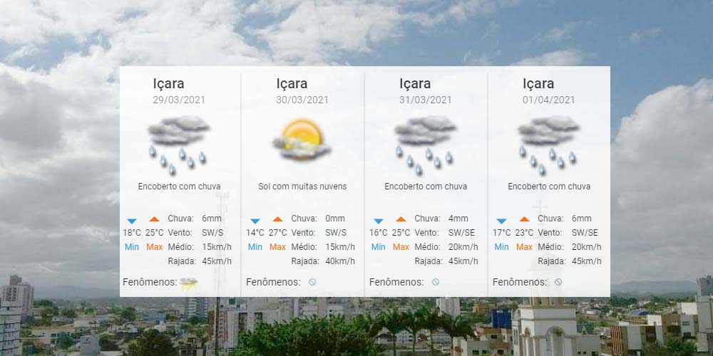 O tempo instável nesta segunda-feira diminui a temperatura e este declínio segue também pelos próximos dias. Para Içara, o Centro de Informações de Recursos Ambientais e de Hidrometeorologia de Santa Catarina indica de 14°C a 27°C no período. Confira a previsão diária completa.
