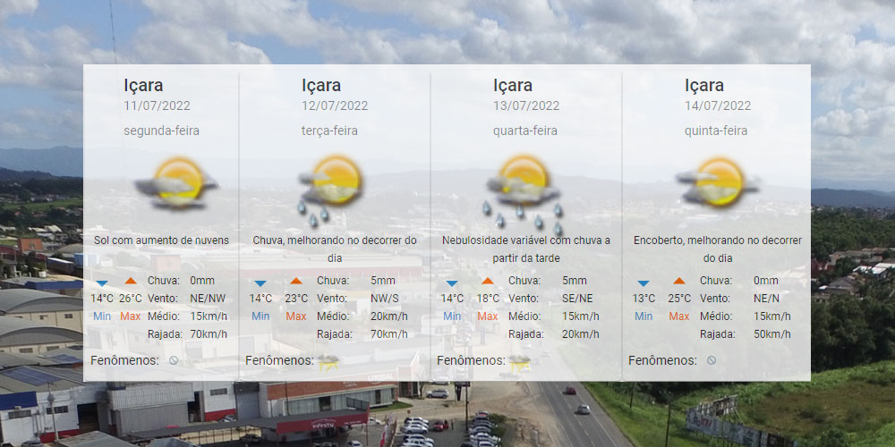 A semana terá tempo bem variado. Para Içara, o Centro de Informações de Recursos Ambientais e de Hidrometeorologia de Santa Catarina indica de 14°C a 26°C. Além disso, aponta rajadas de vento de até 70km/h e chuva de 5mm entre terça e quarta-feira. Confira a previsão completa: