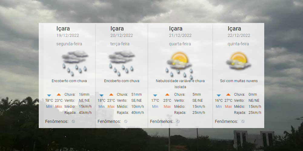 A chuva persiste neste início dessa semana com possibilidade de volumes elevados. Para Içara, o Centro de Informações de Recursos Ambientais e de Hidrometeorologia de Santa Catarina indica até 51mm na terça-feira, dia 20, o que representa risco de alagamentos se a precipitação ocorrer em um espaço curto de tempo. Quanto a temperatura, a tendência é de elevação dia-a-dia. Confira a previsão completa.
