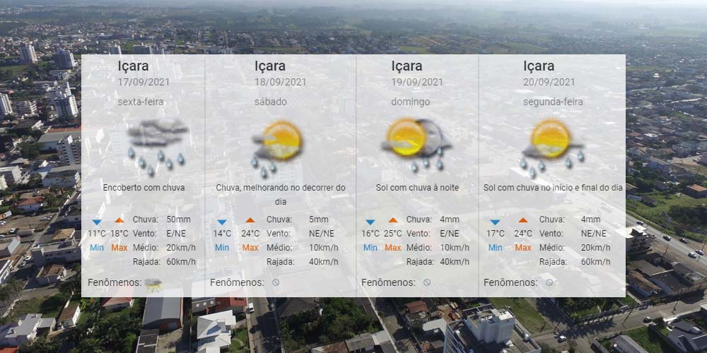 Além de totais elevados de chuva com até 50mm, há risco de temporais localizados nesta sexta-feira, dia 17. No sábado a instabilidade continua, mas com aberturas de sol a partir da tarde. Já no domingo, o indicativo é da presença mais frequente do sol. Quanto as temperaturas, para Içara, o Centro de Informações de Recursos Ambientais e de Hidrometeorologia de Santa Catarina aponta mínimas de 11°C a 17°C e máximas de 18°C a 25°C. Confira a previsão completa.