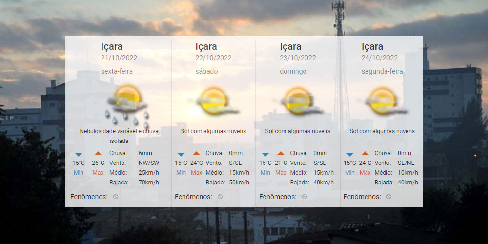A semana nebulosa e escura encerra com a volta do predomínio do sol. As nuvens ainda estarão presentes, mas sem condições de chuva. Para Içara, o Centro de Informações de Recursos Ambientais e de Hidrometeorologia de Santa Catarina aponta temperatura em elevação com mínimas de 15°C e máximas de 21°C a 26°C. Confira o detalhamento: