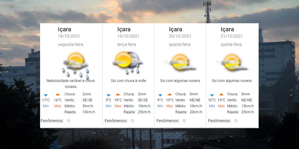 O início da semana será de céu nublado e chuva. Mas ainda essa semana deve mudar com o predomínio do sol. Essa mudança inicia já na quarta-feira, mas não significa inicialmente calor. Para Içara, o Centro de Informações de Recursos Ambientais e de Hidrometeorologia de Santa Catarina aponta temperaturas de 9°C a 19°C no período. Confira a previsão completa.