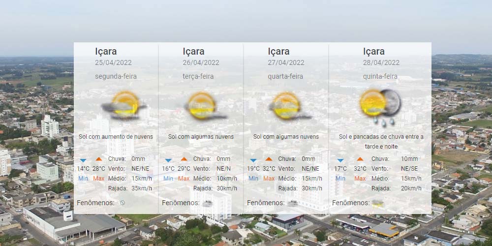 A nebulosidade deve aumentar nos próximos dias. Mas as condições de chuva chegam somente na quinta-feira ao Litoral Sul. Quanto as temperaturas, o indicativo do Centro de Informações de Recursos Ambientais e de Hidrometeorologia de Santa Catarina é de elevação. Os termômetros vão marcar de 14°C a 32°C nesta semana.