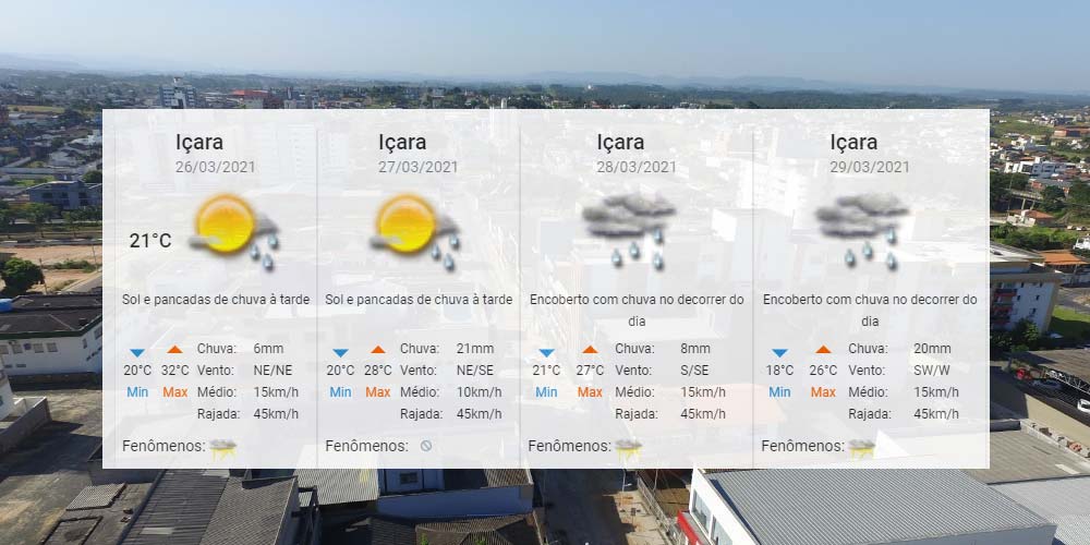 A temperatura elevada permanece até este sábado com possibilidade de pancadas de chuva. Já no domingo, a instabilidade aparece em todas as regiões do estado com a redução do calor devido a cobertura de nuvens. Para Içara, o Centro de Informações de Recursos Ambientais e de Hidrometeorologia de Santa Catarina aponta de 18°C a 32°C. Confira a previsão completa.