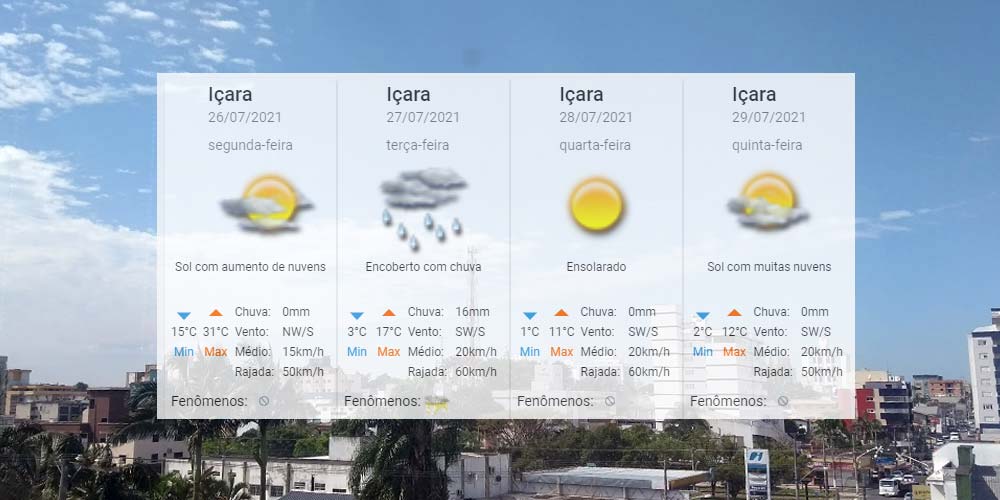 Tempo: instável com chuva e trovoadas isoladas em SC, devido ao deslocamento de uma frente fria, primeiramente na divisa com o RS e no decorrer do dia nas outras regiões.