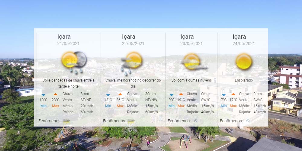 A nebulosidade diminui neste fim de semana junto com a queda também da temperatura. Para Içara, o Centro de Informações de Recursos Ambientais e de Hidrometeorologia de Santa Catarina aponta de 7°C a 26°C nestes próximos dias. Confira a previsão completa.