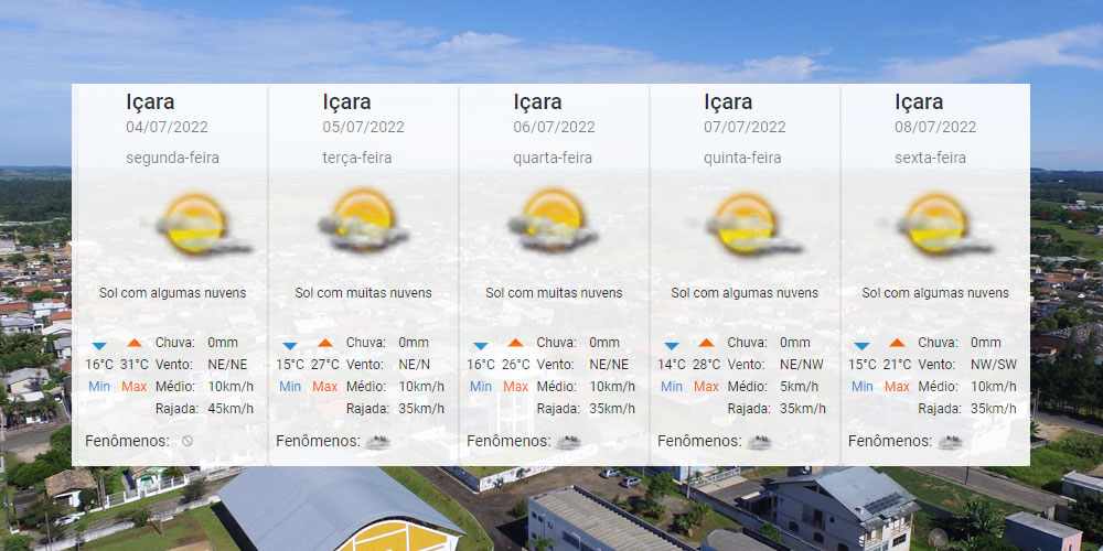 Para quem gosta de calor, essa será uma boa semana. Para Içara, o Centro de Informações de Recursos Ambientais e de Hidrometeorologia de Santa Catarina indica de 14°C a 31°C, sendo a temperatura máxima nesta segunda-feira. Confira a previsão completa.