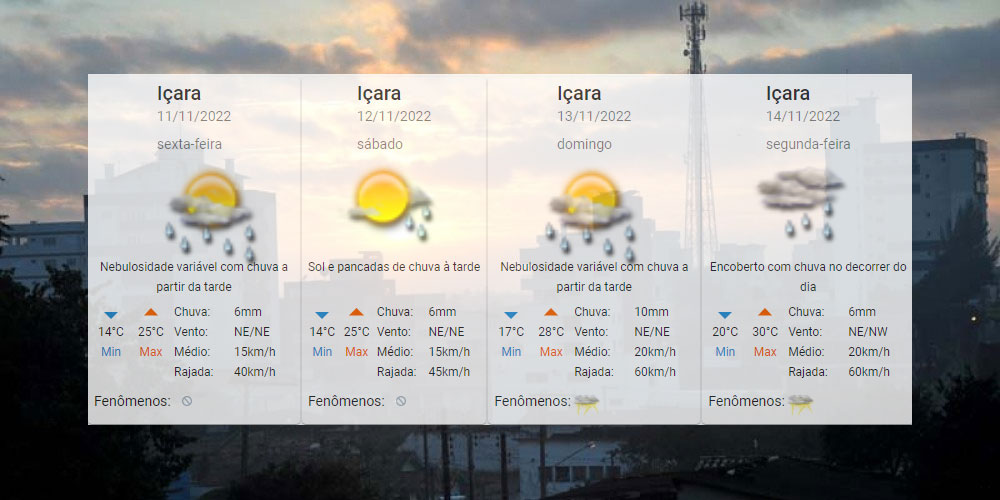 A temperatura vai subir gradativamente ao longo dos próximos dias. A previsão é que chegue próximos dos 30°C já na segunda-feira, dia 14. Conforme o Centro de Informações de Recursos Ambientais e de Hidrometeorologia de Santa Catarina, as condições de chuva também vão aumentar, mas com volumes moderados, de até 10mm em Içara.