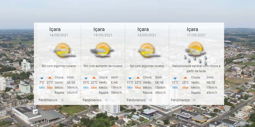 Mesmo com a presença do sol, os termômetros não vão subir muito nos próximos dias. Para Içara, o Centro de Informações de Recursos Ambientais e de Hidrometeorologia de Santa Catarina aponta de 7°C a 23°C entre o fim e início da próxima semana. Confira a previsão completa.