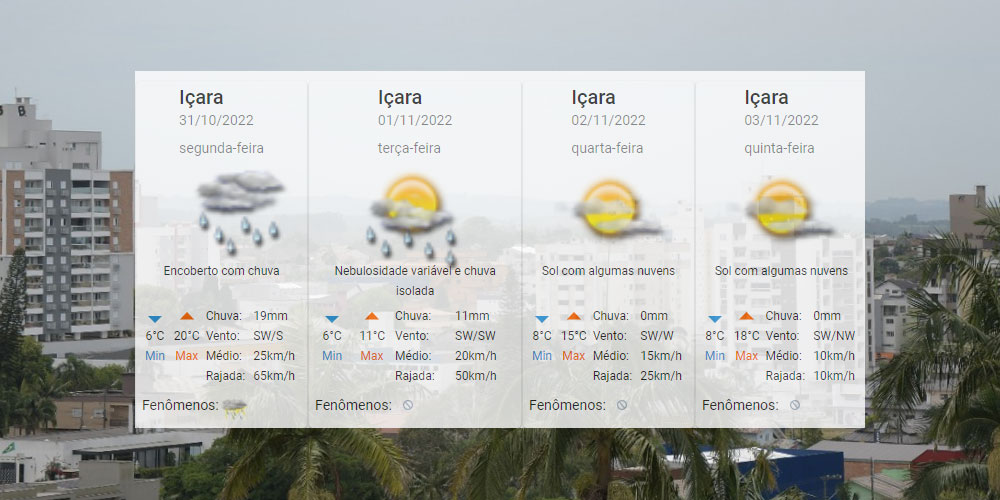 O céu encoberto representa a possibilidade de chuva até terça-feira, dia 1. A nebulosidade vai diminuir a partir de quarta, mas seguirá a temperatura amena no restante da semana. Para Içara, o Centro de Informações de Recursos Ambientais e de Hidrometeorologia de Santa Catarina indica mínimas de 6°C a 8°C e máximas de 11°C a 20°C. Confira a previsão completa: