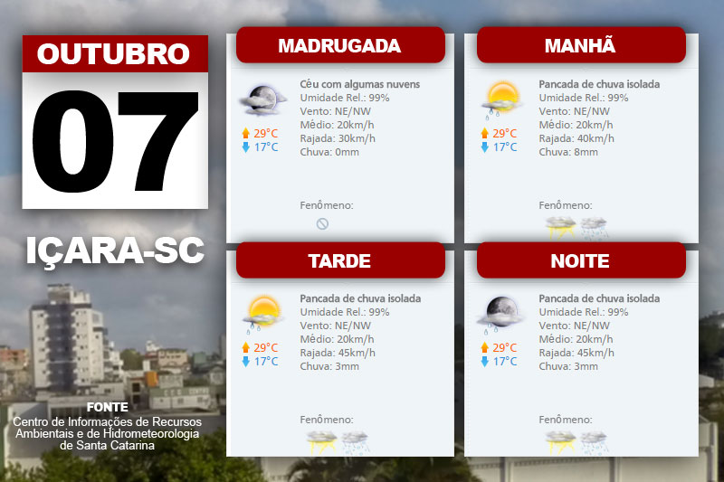 O Sol ainda marca presença, mas a quarta-feira inicia sob condições também de pancadas isoladas de chuva do Oeste ao Litoral Sul, especialmente nas áreas mais próximas ao Rio grande do Sul. “Temperatura em elevação. Vento de nordeste a noroeste, fraco a moderado, com rajadas”, completa a meteorologista do Centro de Informações de Recursos Ambientais e de Hidrometeorologia de Santa Catarina, Gilsânia Cruz.