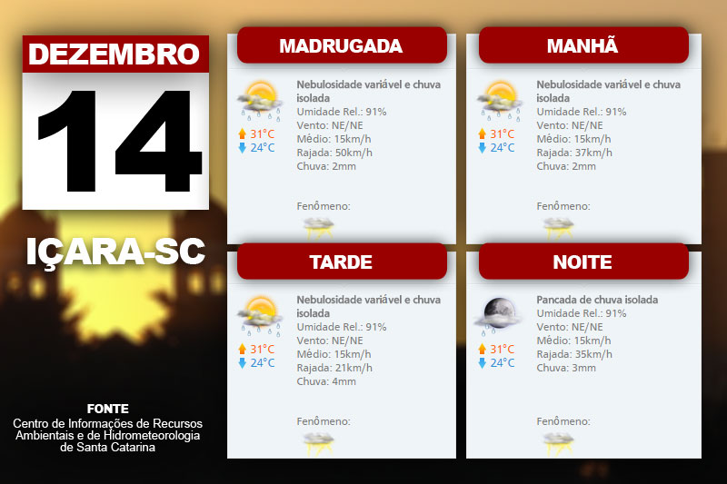 No Oeste e Meio Oeste, as pancadas isoladas de chuva aparecem no inicio do dia e a partir da tarde. Nas demais regiões catarinenses, a chuva ocorre somente da tarde para a noite. Além disso, o Centro de Informações de Recursos Ambientais e de Hidrometeorologia de Santa Catarina indica também temperatura elevada nesta segunda-feira.
