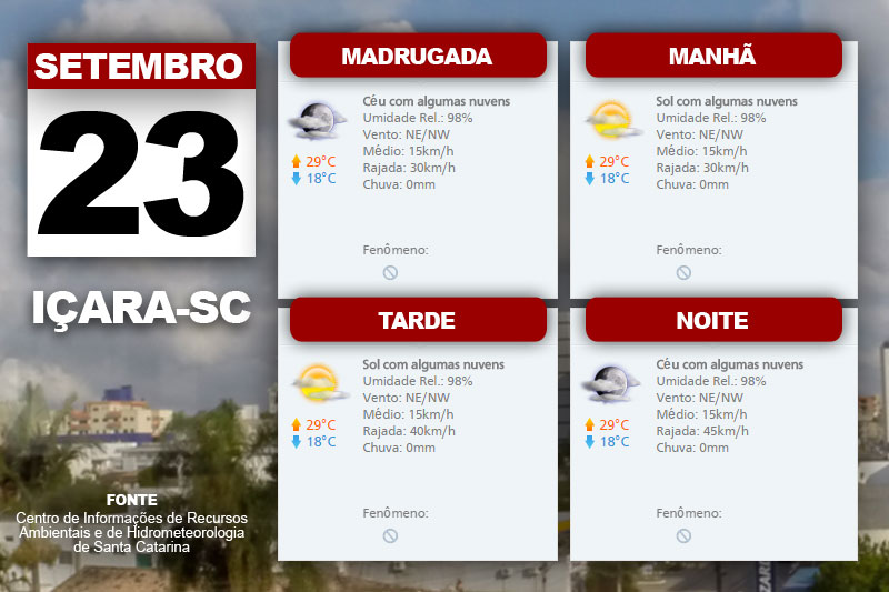 A primavera começa com tempo segue seco e quente, com sol entre algumas nuvens em Santa Catarina nesta quarta-feira. Pela manhã persiste a condição de nevoeiro e névoa úmida, especialmente, no Litoral e Vale do Itajaí. "Temperatura elevada, superando 30ºC em boa parte do estado. Vento de nordeste a noroeste, fraco a moderado, com rajadas", aponta também a meteorologista do Centro de Informações de Recursos Ambientais e de Hidrometeorologia de Santa Catarina, Gilsânia Cruz.