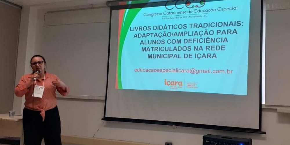 O trabalho do Núcleo de Produção de Materiais do Atendimento Educacional Especializado de Içara foi apresentado em Florianópolis nesta terça-feira, dia 10. A participação no Congresso Catarinense de Educação Especial, na Universidade Federal de Santa Catarina (UFSC), ocorreu sobre os a adaptação/ampliação de livros didáticos para alunos com deficiência matriculados na Rede Municipal de Içara. A apresentação foi realizada pela professora Maria Izabel Luiz.