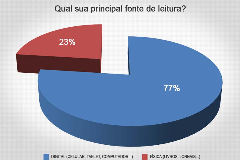 Entre os internautas que acessam o Canal Içara o uso de celular, tablet ou computador já é a principal fonte de leitura. Eles correspondem a 77% dos participantes da enquete feita pelo portal entre os dias 9 e 16 de novembro. Isto significa que para 23% a preferência ainda é por meios físicos como livros e jornais. Ao todo, a pergunta na capa do Canal Içara teve a participação espontânea de 35 pessoas.