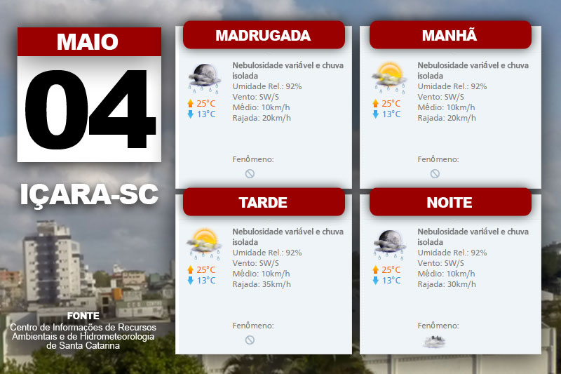 Os períodos de sol serão intercalados com momentos de maior nebulosidade no estado. No litoral, a chance é também de chuva fraca e isolada. O Centro de Informações de Recursos Ambientais e de Hidrometeorologia de Santa Catarina indica ainda temperatura mais elevada no interior e mais baixa no litoral. Além disso, aponta vento nordeste a sul, fraco a moderado, com rajadas mais intensas no litoral.
