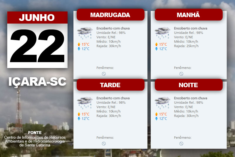 A chuva encobre o estado nesta quarta-feira com espaço para aberturas de sol principalmente à tarde no Oeste e Meio Oeste. A previsão é de uma elevação modesta na temperatura devido à nebulosidade. O Centro de Informações de Recursos Ambientais e de Hidrometeorologia de Santa Catarina indica ainda vento fraco a moderado de nordeste, com variação de leste do Planalto ao Litoral.