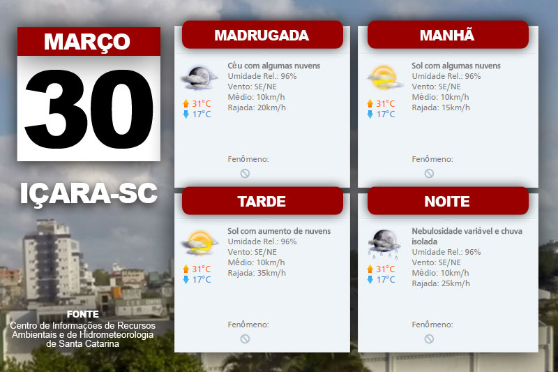 O Sol aparece junto com algumas nuvens durante o dia na maioria das regiões do estado. A chance de chuva aumenta na Grande Florianópolis, Vale do Itajaí e Litoral Norte, especialmente, no período noturno. O Centro de Informações de Recursos Ambientais e de Hidrometeorologia de Santa Catarina indica ainda temperatura em elevação durante, além de vento fraco de sudeste a nordeste.