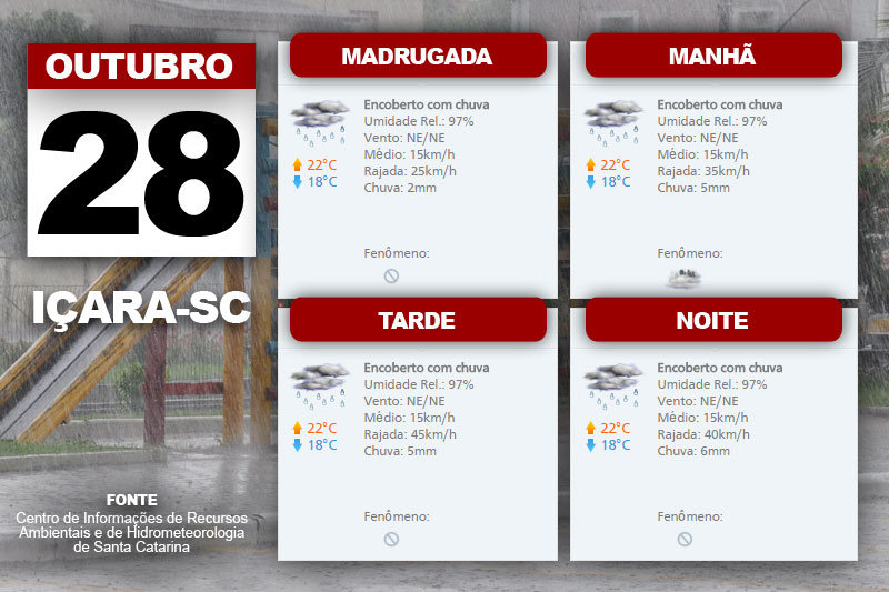 A chuva fraca a moderada no Litoral se estende ao Vale do Itajaí e Planalto devido aos ventos úmidos do mar. No Oeste, Meio Oeste e Sul do Estado o sol aparece entre muitas nuvens no decorrer do dia. “Temperatura mais elevada no Oeste e Meio Oeste, e amena nas demais regiões. Vento de leste a nordeste, fraco a moderado com rajadas no Litoral”, conclui a meteorologista do Centro de Informações de Recursos Ambientais e de Hidrometeorologia de Santa Catarina, Gilsânia Cruz.