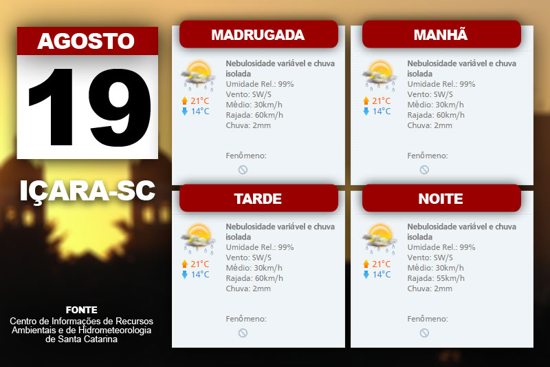 As nuvens aparecem durante todo o dia com chuva fraca e isolada no Litoral Sul nesta quarta-feira, dia 19. A frente fria afasta-se, associada a um ciclone extratropical no litoral Sul do Brasil, e uma massa de ar seco e frio passa a atuar no Estado. “Temperatura em declínio. Vento de sudoeste a sul, moderado com rajadas”, coloca a meteorologista do Centro de Informações de Recursos Ambientais e de Hidrometeorologia de Santa Catarina, Laura Rodrigues.