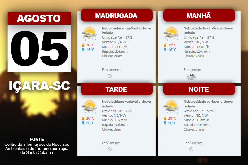Condições de chuva fraca ocorrem no Planalto Sul e Litoral Sul nesta quarta-feira, dia 5. “A temperatura fica mais amena no Sul do estado e em elevação nas demais regiões. Vento de nordeste a noroeste, fraco a moderado”, sinaliza também a meteorologista do Centro de Informações de Recursos Ambientais e de Hidrometeorologia de Santa Catarina, Gilsânia Cruz.