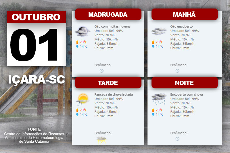 A presença de nuvens aumenta em todas as regiões com pancadas de chuva e trovoada à tarde e noite. “Temperatura em elevação. Vento de nordeste, fraco a moderado”, também aponta a meteorologista do Centro de Informações de Recursos Ambientais e de Hidrometeorologia de Santa Catarina, Laura Rodrigues.
