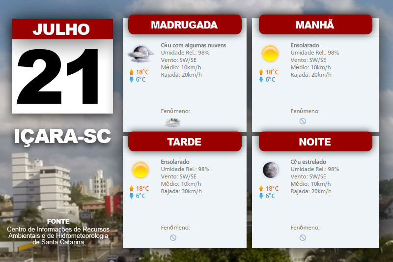 Poucas nuvens encobrem os catarinenses ao longo desta quinta-feira. E a previsão é que a temperatura baixa do amanhecer tenha ainda gradativa elevação durante o dia. O Centro de Informações de Recursos Ambientais e de Hidrometeorologia de Santa Catarina indica também vento fraco de sudoeste a sudeste.