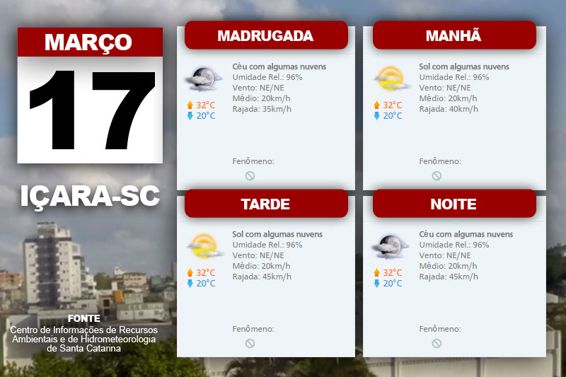 O tempo seco predomina com sol em todas as regiões nesta quinta-feira, dia 17. O Centro de Informações de Recursos Ambientais e de Hidrometeorologia de Santa Catarina indica ainda temperatura elevada. Além disso, aponta vento nordeste, fraco a moderado, com rajadas.