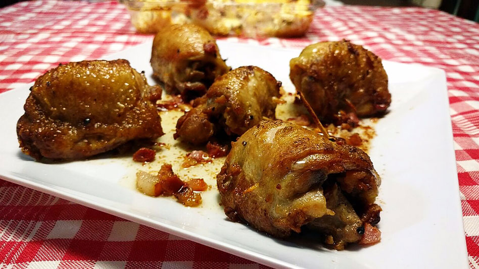 Separe 1kg de sobrecoxas desossadas, 200g de bacon picado, manteiga, sal, pimenta do reino e óleo. O modo de preparo está no vídeo. A quantidade de muitos ingredientes depende do gosto do cozinheiro... Confie em seu talento e reinvente a receita.