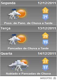 Nesta segunda-feira, dia 12, a presença de sol é acompanhada do aumento de nuvens nas regiões do Extremo Oeste e Oeste. Nas demais regiões, sol, mais nuvens e pancadas isoladas de chuva com descargas atmosféricas entre tarde e noite devido a uma frente fria no litoral do Rio Grande do Sul e à formação de um cavado em Santa Catarina. Temperatura em elevação.