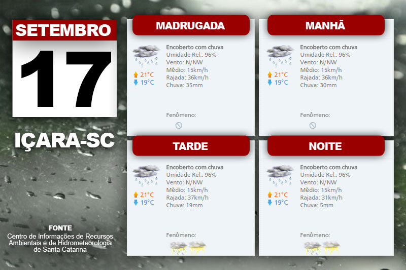 A chuva persiste na maior parte das regiões catarinenses entre esta quinta e sexta-feira, exceto no Planalto Norte e Litoral Norte, onde o Sol aparece em alguns momentos. No Meio Oeste, Planalto Sul e Litoral Sul, os elevados totais de precipitação nestes dois dias serão de 100 mm ou mais. Por isso, há risco de temporal com ventania e granizo. “Temperatura elevada. Vento de nordeste a noroeste, fraco a moderado, com intensas rajadas associadas a temporais”, alerta a meteorologista do Centro de Informações de Recursos Ambientais e de Hidrometeorologia de Santa Catarina, Laura Rodrigues.