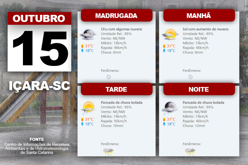 As nuvens aumentam e provocam chuva a partir do início da tarde nas regiões de divisa com o Rio Grande do Sul nesta quinta-feira. Nas demais regiões, a chuva inicia no fim da noite. “Risco de temporal isolado com rajadas fortes de vento e granizo. Vento de nordeste a noroeste, moderado com rajadas, principalmente no Litoral”, acrescenta o meteorologista do Centro de Informações de Recursos Ambientais e de Hidrometeorologia de Santa Catarina, Erikson de Oliveira.