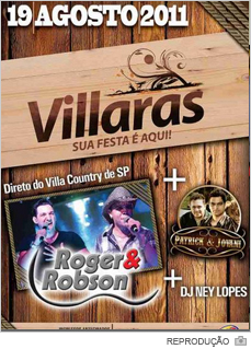 Direto do Villa Country de São Paulo para Içara, a dupla Roger & Robson é o investimento do Villaras para a festa desta sexta-feira, dia 19. A balada na comunidade do Mareli ainda terá Patrick & Jovani, além do DJ Ney Lopes. Em Içara, os ingressos estão disponíveis no Auto Posto Nicão. Já em Criciúma podem ser comprados no Auto Posto Chile I. Antecipado, o bilhete masculino custa R$ 20. E o feminino, R$ 10.