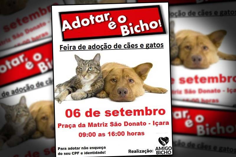A ONG Amigo Bicho vai promover mais uma edição da feira de adoção neste próximo sábado, dia 6. O evento acontecerá na Praça da Matriz das 9h às 16h com cães e gatos. Para exercer a solidariedade e levar um animalzinho será preciso apresentar então o documento de identidade e o CPF.