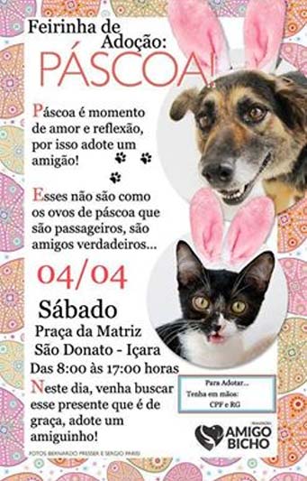 Sábado terá mais uma Feirinha de Adoção de cães e gatos da Amigo Bicho. Porém, não será uma feirinha comum. O evento acontecerá especialmente pela Páscoa. Muitos peludinhos estão ansiosos por um lar cheio de amor e carinho! O funcionamento acontecerá das 8h às 17h na Praça da Matriz. Para adotar é preciso levar CPF e RG.