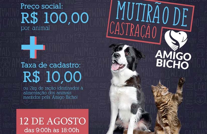 “O valor da castração é de R$ 100 por animal (independente se for cão ou gato) e mais R$ 10 ou 2kg de ração destinados à alimentação dos animais resgatados pela ONG, um total de R$ 110 que deverão ser pagos à vista em dinheiro”, explica a voluntária. O cadastro deve ser feito pelo e-mail ong_amigobicho@hotmail.com.