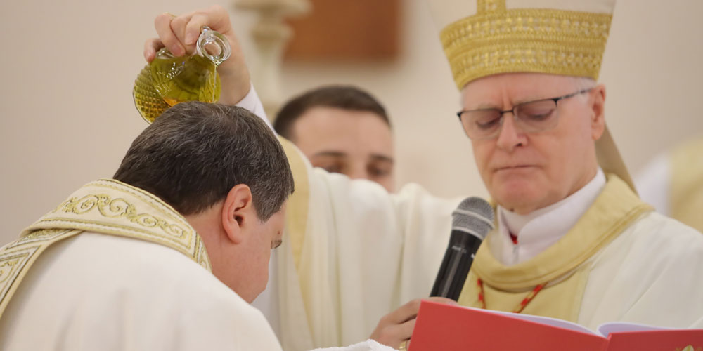 A emoção que transbordava nos olhos de Ângelo Ademir Mezzari durante boa parte de sua ordenação episcopal, no Santuário Sagrado Coração Misericordioso de Jesus, é reflexo de uma vida inteira dedicada ao serviço pastoral. Horas mais cedo, ainda em ritmo de preparação, o então monsenhor, de fala serena e olhar profundo, conversava e cumprimentava a todas equipes de trabalho em Içara. Apesar da calma, característica de sua personalidade, o apertar de suas próprias mãos e o movimento da cabeça – que parecia buscar alguém no templo ainda vazio – denunciavam a sua ansiedade.