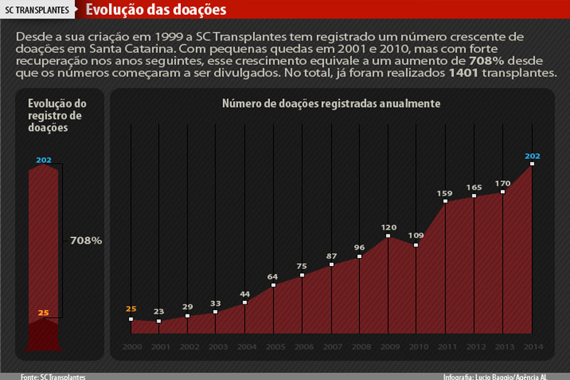 Apesar do recorde proporcional de transplantes em 2014 no país, Santa Catarina busca conscientizar a população a se engajar ainda mais na causa. São 32,6 doadores por milhão de habitante. No último ano ocorreram 202 doações realizadas. Isto significa 32 a mais que 2013. Atualmente há 49 hospitais capacitados para retirada de órgãos.