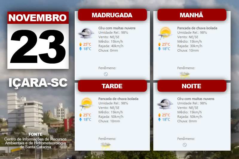 O tempo instável significa pancadas de chuva e descarga elétrica a qualquer hora do dia nesta segunda-feira. Do Oeste ao Norte do estado há risco também de temporal. Conforme o Centro de Informações de Recursos Ambientais e de Hidrometeorologia de Santa Catarina, em consequência da cobertura de nuvens, a elevação da temperatura será pequena.