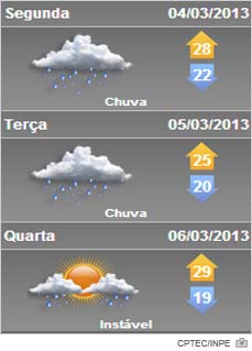 Segunda-feira de tempo instável com céu encoberto e chuva em boa parte do dia. O risco de temporais diminui. Temperatura elevada com sensação de ar abafado. Ainda durante a terça a instabilidade permanece em Santa Catarina com chuva na maioria das regiões. A melhora ocorre entre a tarde e noite a partir do Oeste e Sul do Estado. Isto devido a aproximação de uma massa de ar seco e um pouco mais frio.
